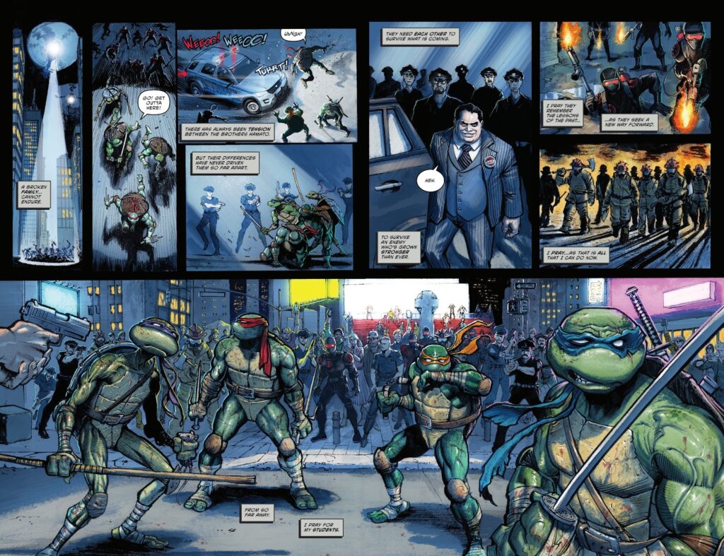 Cada uno de los artistas funciona dentro del registro de sus historias, que pese a ser muy diferentes entre sí, van generando el clima de base de la serie. De nuevo en la idea de si es un buen sitio para subirse a los quelonios del clan Hamato, Teenage Mutant Ninja Turtles 1: Regreso a Nueva York es todo el volumen en sí mismo una presentación, una acercamiento individual cada protagonista —y antagonista— fuera de su elemento para definir los rasgos esenciales de cada uno y, poco a poco, ir uniendo elementos para establecer sus dinámicas como grupos. Aaron quiere dejarnos bien claro la familia disfuncional que son. Son cuatro tipos verdes demasiado duros para decirse lo mucho que se quieren, cuyo modo de mostrarse afecto parece ser estar todo el día a la gresca —muy en la T del «teenage» de su nombre—, aunque realmente no puedan vivir separados. Hale será el encargado de ponerlos, ya como grupo, en ese barro en el que ya los hemos visto hundirse por separado, al poner contra ellos a la propia ciudad de Nueva York.