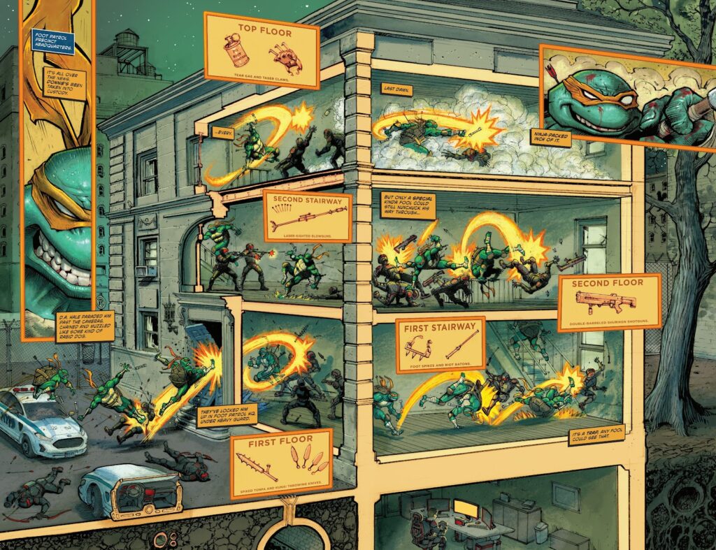 Recordemos que aquellas tortugas primigenias caminaban en una línea muy fina entre la parodia y la flipada épica. Las referencias desvergonzadas al Daredevil de Frank Miller la situaban a medio camino entre el homenaje continuista y la sátira y casi tenían más que ver con el Cerebus del principio que con la versión de dibujos animados que las popularizara para siempre. Tengamos en cuenta que, viéndolo desde cierta distancia y sin su contexto actual, estamos hablando de un puñado de caricaturas de animales antropomórficos que discuten entre ellos y se arrean de mamporros con ninjas. Por más que se ponga la excusa de los mutantes, esto no son tortugas humanoides sino caricaturas, que solo deberían poder funcionar en un tebeo o en los dibujos animados… pero funcionan, y mucho más allá de lo inicialmente esperado, gracias a la generación de su propia mitología, contexto y código.