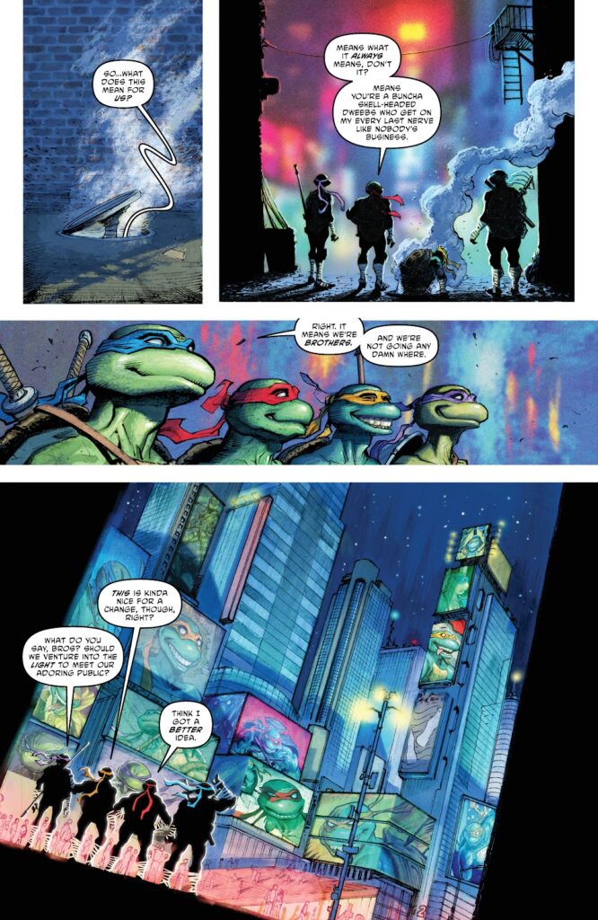 Hasta cierto punto Teenage Mutant Ninja Turtles 2: Nueva York vs. las Tortugas Ninja guarda cierta semejanza estructural con el tomo anterior. Cada uno de los cuatro primeros capítulos está narrado por una de nuestras tortugas en un ejercicio donde de nuevo Aaron pone toda la carne en el asador de encontrar la voz propia de cada uno, pero de algún modo ahora es todo distinto y el hecho de tener a Ferreyra como único dibujante es clave. Más allá del gancho comercial de los nombres de Burnham, Jones, Albuquerque, Chiang o Robertson, se trataba de presentar a los protagonistas separados, alejados. En este tomo, pese al enfoque en la voz individual, hay una clara intención de historia única, de reunión, de redención y regeneración de vínculos.